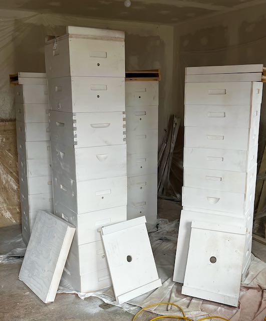 Our 2023 equipment build is almost complete. Except for the one hive box with box joints, all our other equipment is being built on site from locally harvested pine. Our thanks go out to Kevin Dowling for setting us up with really high quality boards from his sawmill.