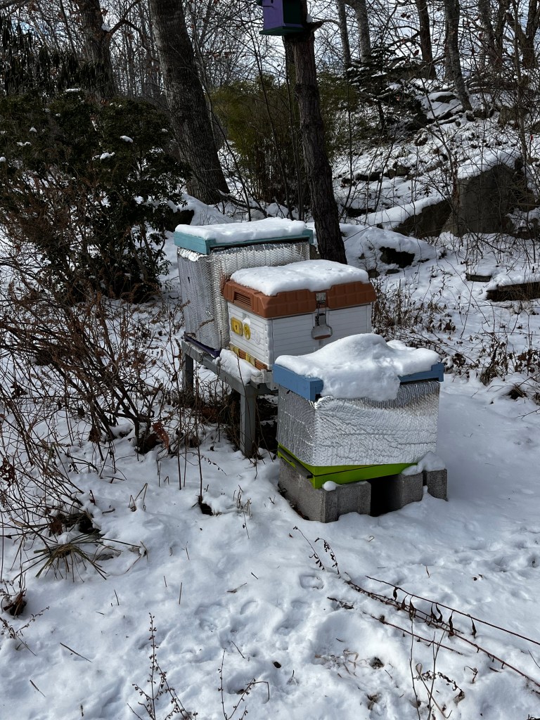 In a managed hive, it is critical that before the cold comes, we ensure that the bees have adequate “stores” for them make it through to the first food available in the spring. To help reduce the amount of stores they go through, most beekeepers also apply insulation or wind protection – but at the same time, it is critical that there is enough ventilation to allow the bees to breathe fresh air and remove humidity from the hive.